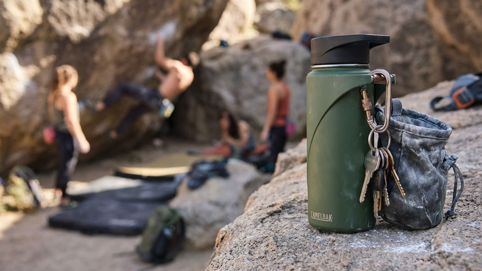 A CamelBak water bottle designed to help climbers move freely on and off the wall.