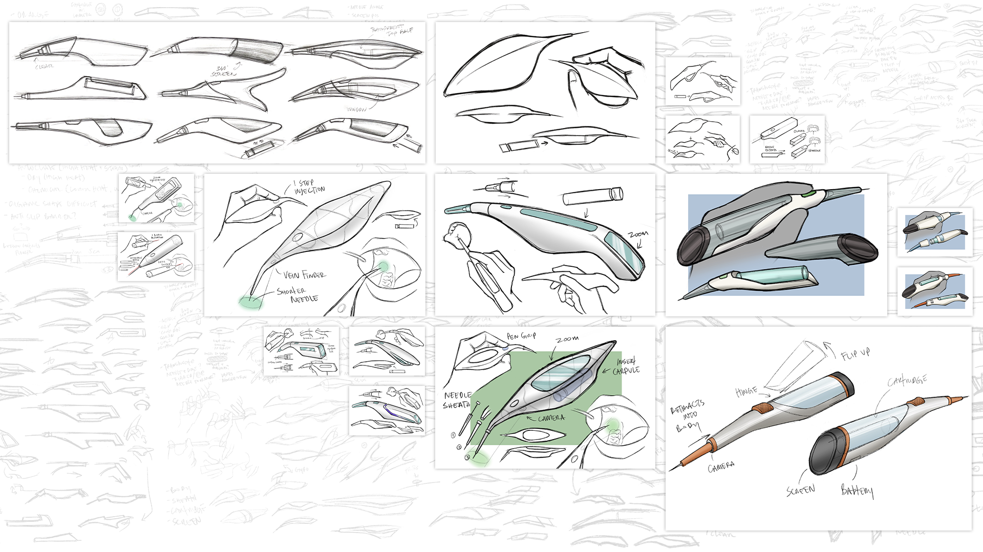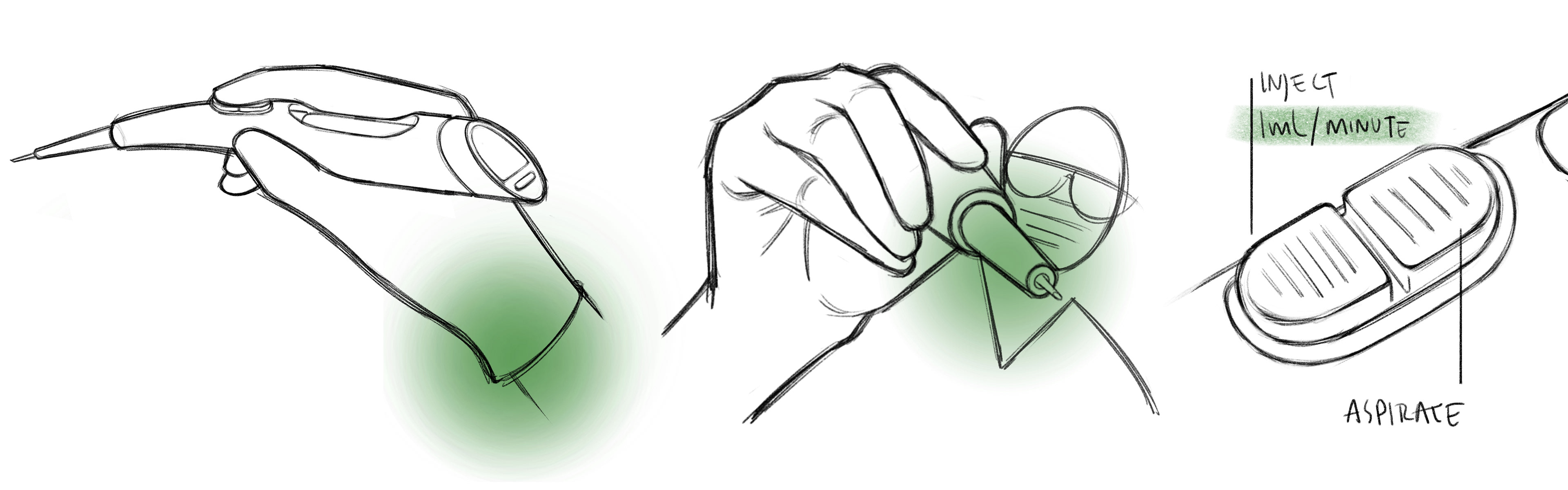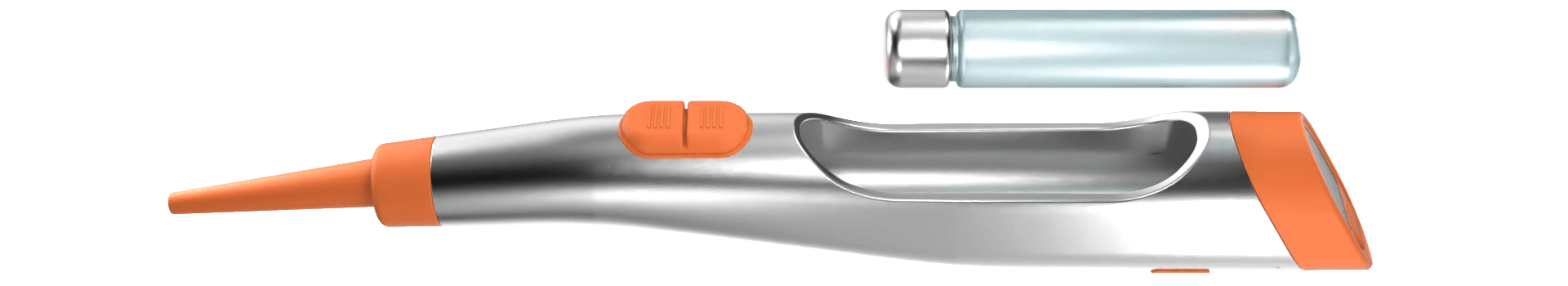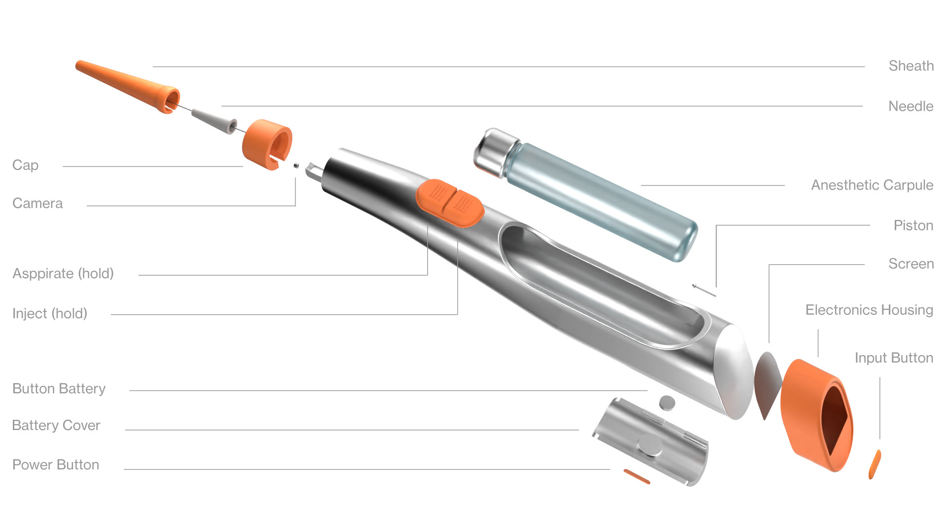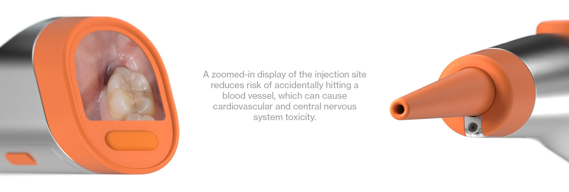 A dental syringe that reframes how patients experience anesthetic procedures. Revised form, materials, and technology fosters a less frightening, more comfortable experience.