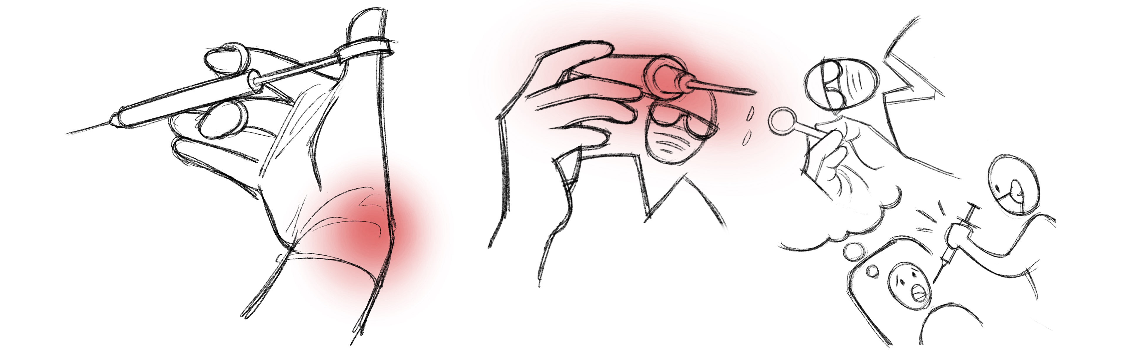 Awkward hand position. Kids (and adults) hate needles. Injecting too fast increases pain.